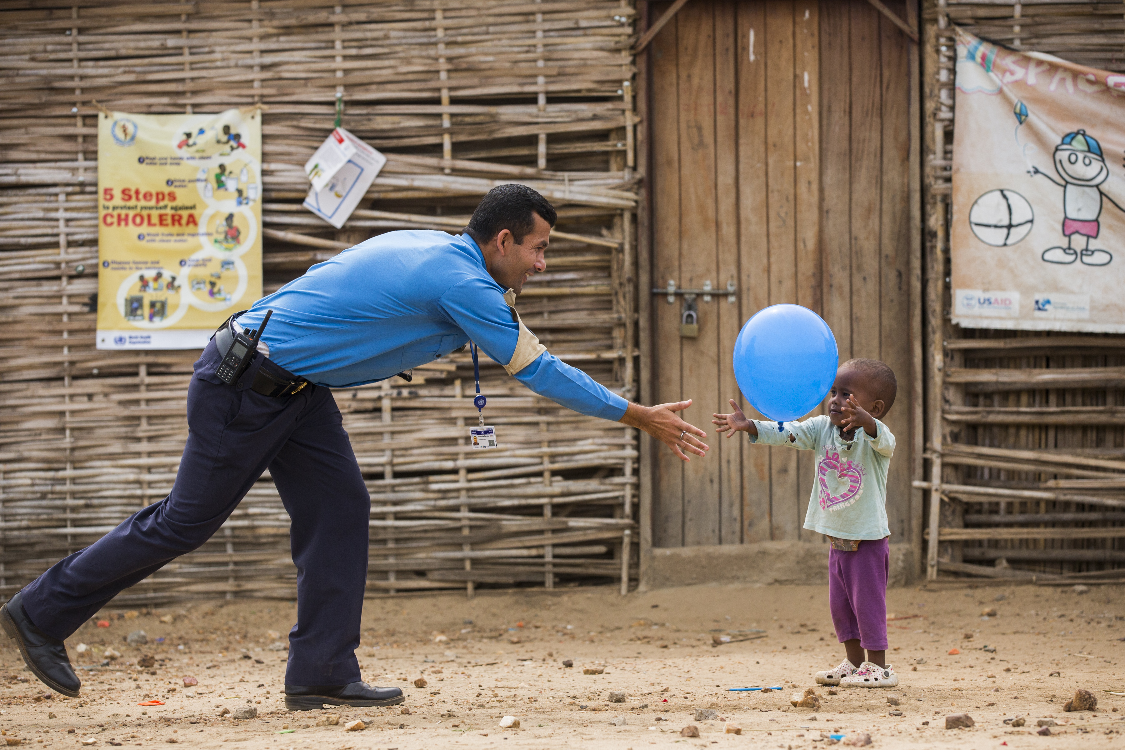 Members of the UNPOL Gender Child and Vulnerable Persons Protection (GCVPP) Unit visit the Temporary Learning Space in Protection of Civilians site 2 to play games with the children who attend school there.